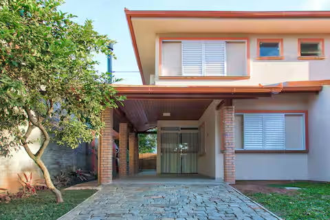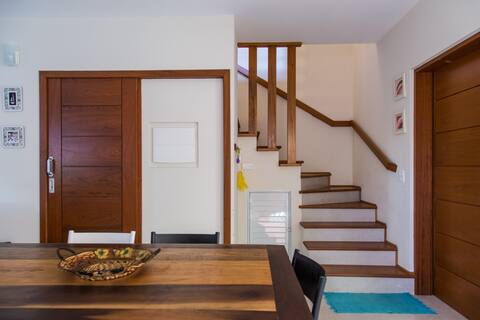Com 126m² distribuídos em dois pisos e terreno exclusivo, a casa é espaçosa, acolhedora e pensada para a vida em família. No pavimento superior, dispõe de dois dormitórios — sendo uma suíte — além de um escritório e dois banheiros. Os quartos contam com ar-condicionado e acomodam confortavelmente, com duas camas de casal.