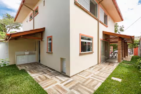 A área externa é um dos grandes encantos da casa: espaço gourmet com churrasqueira, jardim cuidadosamente ajardinado, deck ao sol e chuveiro externo — cenários ideais para encontros, descanso e momentos ao ar livre.